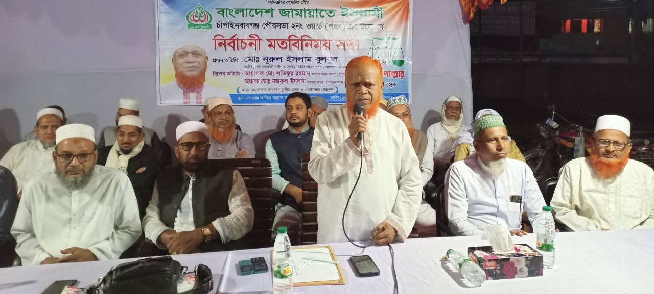 মাহিদুল ইসলাম ফরহাদ : চাঁপাইনবাবগঞ্জ-৩ (সদর) আসনের পৌরশহরের ২নং ওয়ার্ডে জামায়াতে ইসলামীর নির্বাচনী মতবিনিময় সভা করেন। সভাস্থলটি হাজার-হাজার নারী পুরুষের উপস্থিতিতে মুখরিত। চাঁপাইনবাবগঞ্জ পৌর আমীর হাফেজ গোলাম রাব্বানীর সভাপতিত্বে রবিবার রাতে অনুষ্ঠিত মতবিনিময় সভায় প্রধান অতিথি হিসেবে উপস্থিত ছিলেন চাঁপাইনবাবগঞ্জ-৩ আসনে জামায়াত মনোনীত সংসদ সদস্য পদপ্রার্থী সাবেক ভিপি নূরুল ইসলাম বুলবুল।