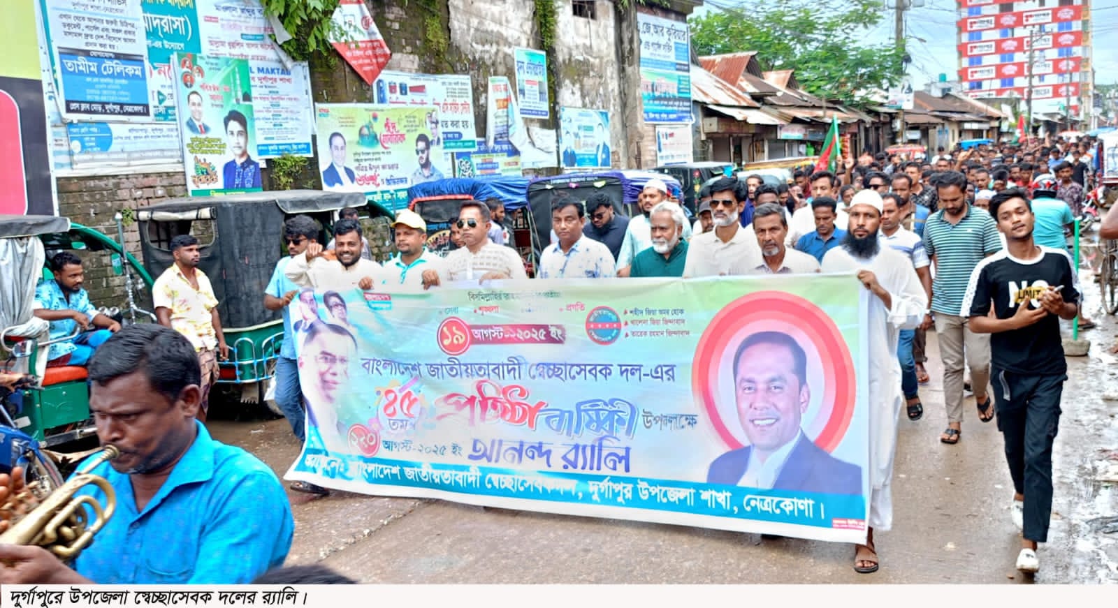 দুর্গাপুর (নেত্রকোনা) প্রতিনিধি : নেত্রকোনার দুর্গাপুরে নানা আয়োজনে বাংলাদেশ জাতীয়তাবাদী স্বেচ্ছাসেবক দলের প্রতিষ্ঠাবার্ষিকী পালিত হয়েছে। উপজেলা স্বেচ্ছাসেবকদলের আয়োজনে বুধবার (২০ আগস্ট) দুপুরে বর্নাঢ্য র্যালি ও আলোচনা সভার মধ্যদিয়ে এ প্রতিষ্ঠাবার্ষিকী পালিত হয়।