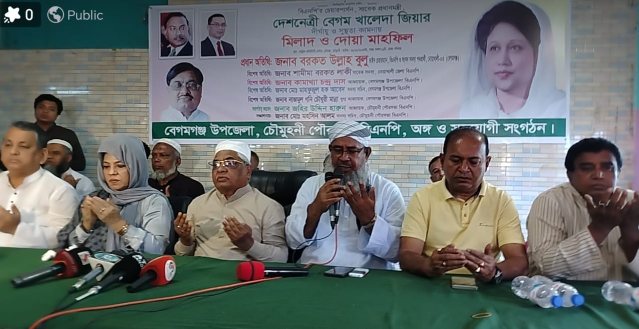 চৌমুহনী পৌরসভা বিএনপির আহবায়ক জহির উদ্দিন হারুন এর সভাপতিত্বে ও যুবদলের আহবায়ক রুস্তম আলী সঞ্চালনায় দোয়া মাহফিলে