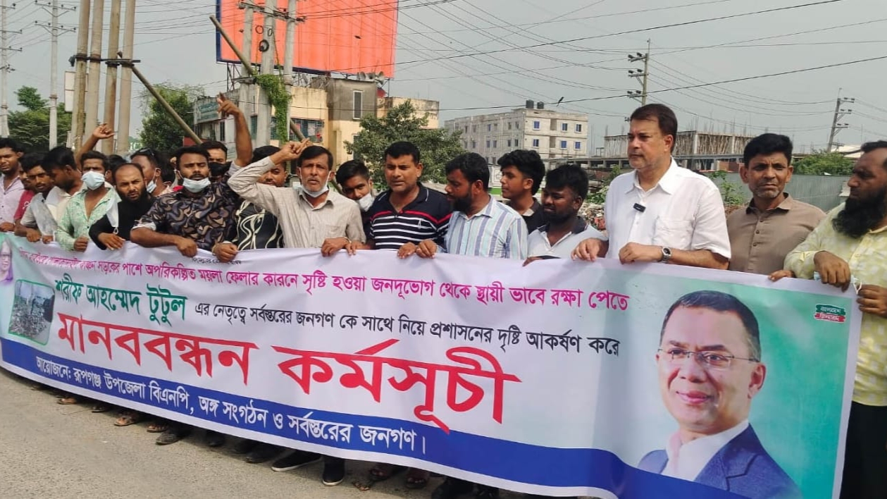 রূপগঞ্জে ময়লার স্তুপ অপসারণের দাবিতে মানববন্ধন