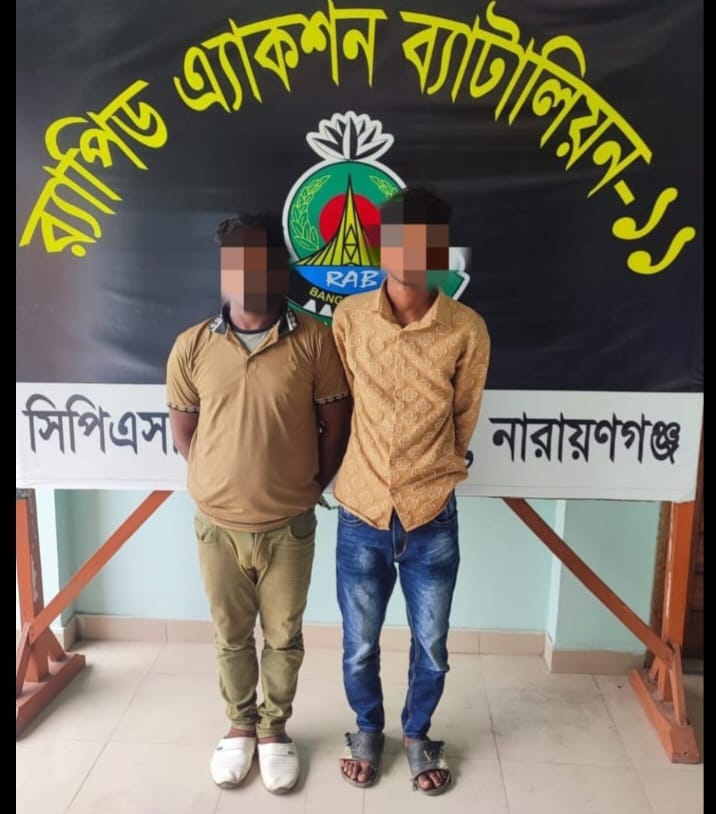 র্যাব-১১ জানায়, গোপন সংবাদের ভিত্তিতে ৪ এপ্রিল ভোরে সোনারগাঁ উপজেলার চেঙ্গাইল এলাকায় অভিযান চালিয়ে ১০২৩ বোতল ফেনসিডিল, স্কাফ, ২৬ কেজি গাঁজা ও এক বোতল বিদেশি মদসহ সুজন মোল্লা (২১) ও জাবেদ (৩৫) নামে দুইজনকে আটক করা হয়। এ সময় মাদক পরিবহনে ব্যবহৃত একটি সিএনজি ও দুটি মোটরসাইকেল জব্দ করা হয়েছে।
