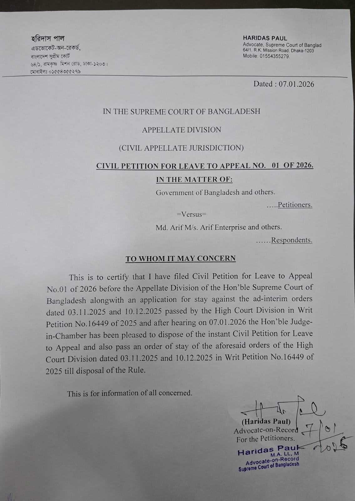 এ সংক্রান্ত সিভিল পিটিশন ফর লিভ টু আপিল নং ০১ অব ২০২৬ দাখিল করে বাংলাদেশ সরকার ও অন্যান্য। প্রতিপক্ষ হিসেবে রয়েছেন মোঃ আরিফ ও এমএস আরিফ এন্টারপ্রাইজসহ অন্যান্যরা।